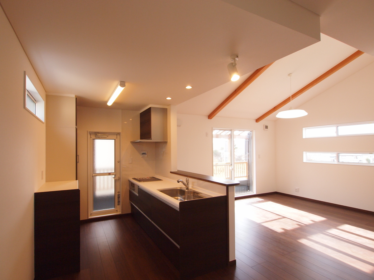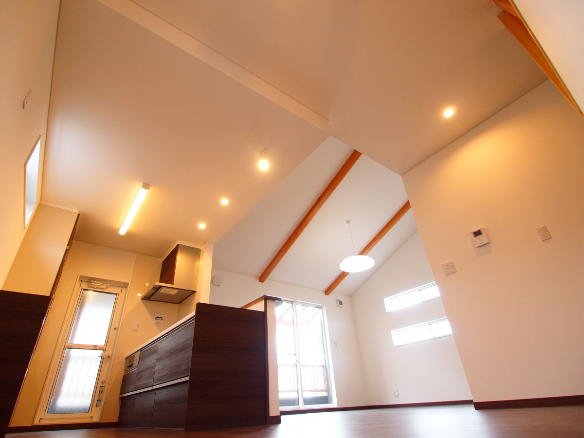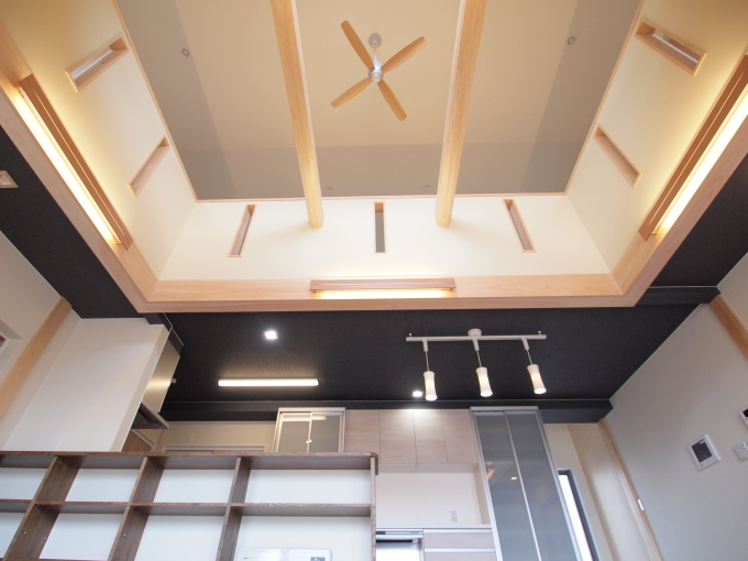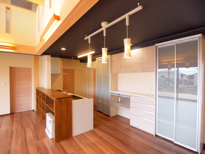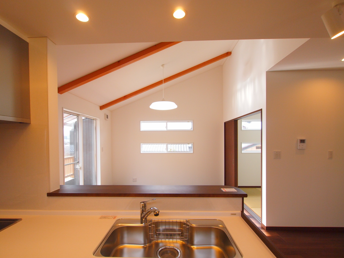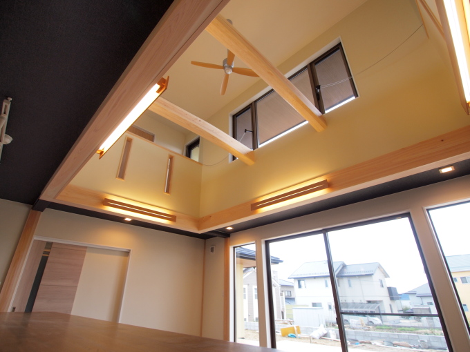地方都市としては小さな宅地の為、2台以上の駐車スペースを確保する為にインナーガレージとし、採光と動線を考えてスキップフロアの中間階をリビングとしました。