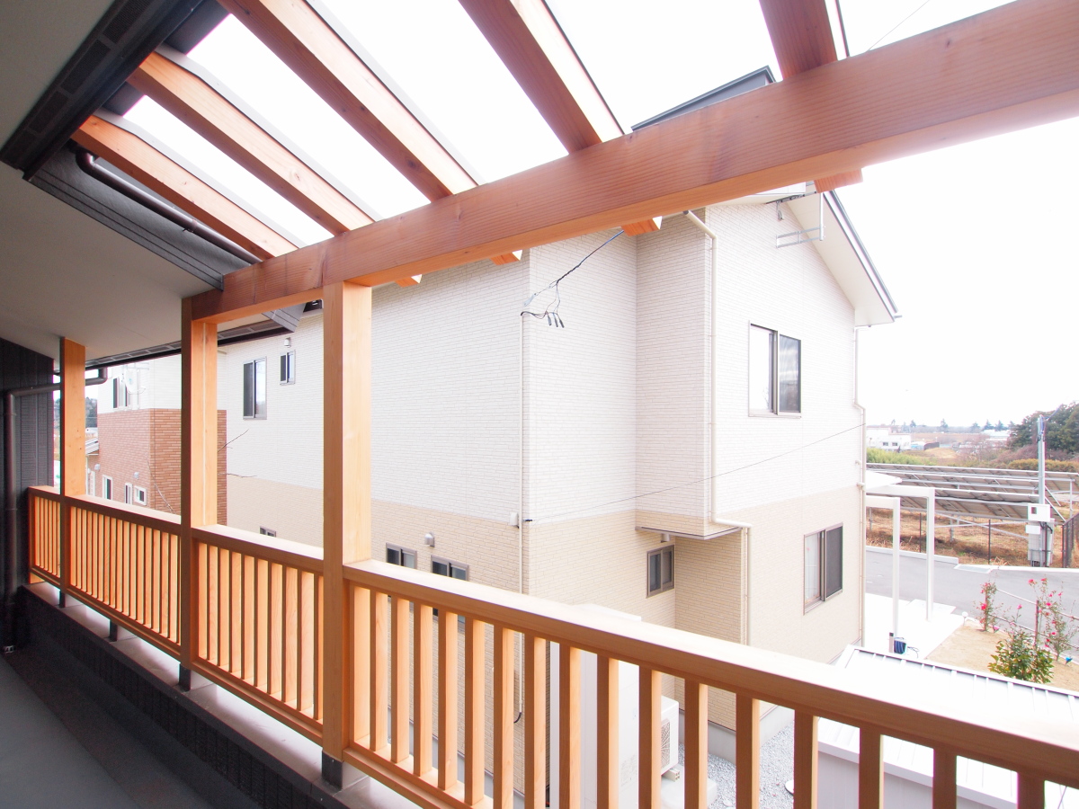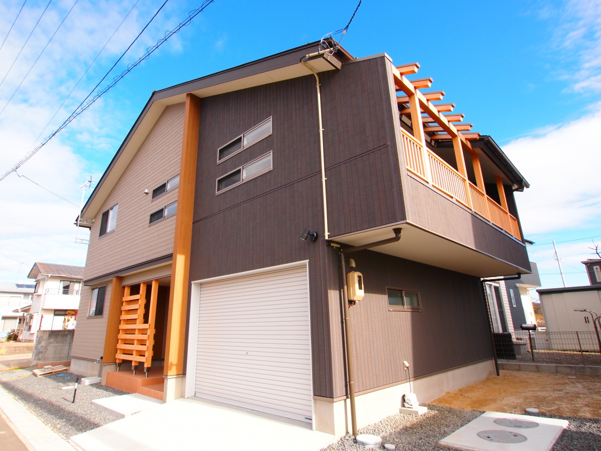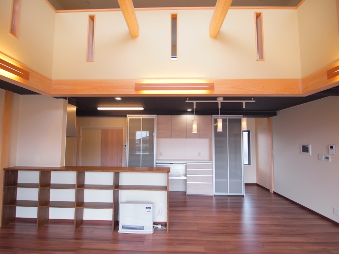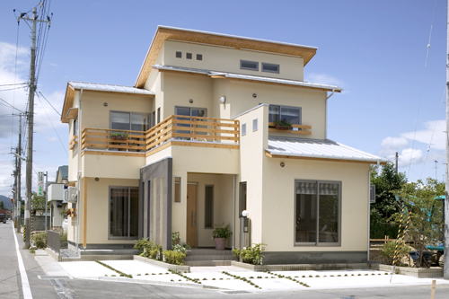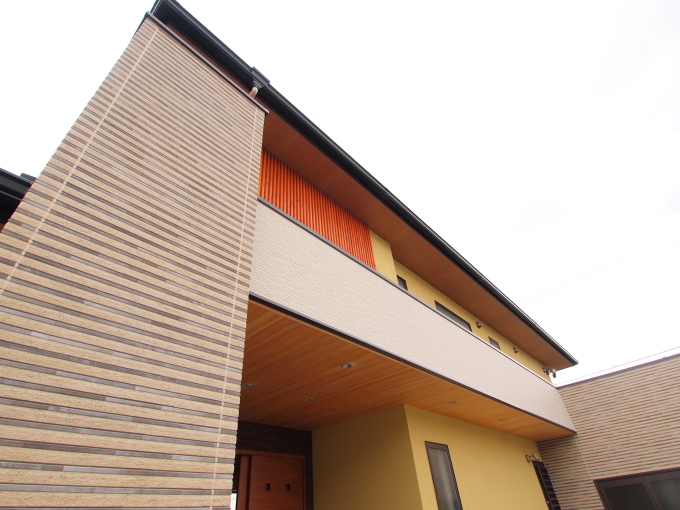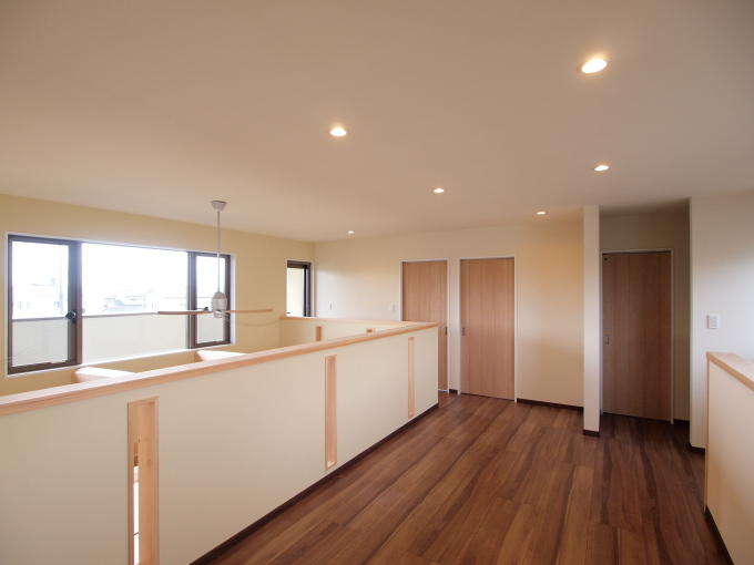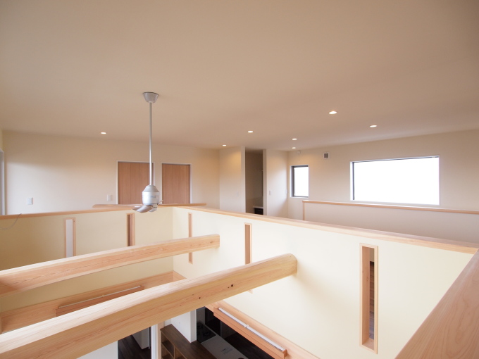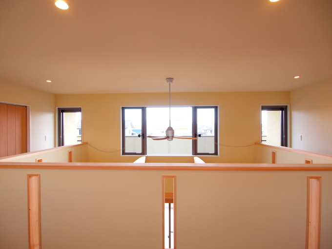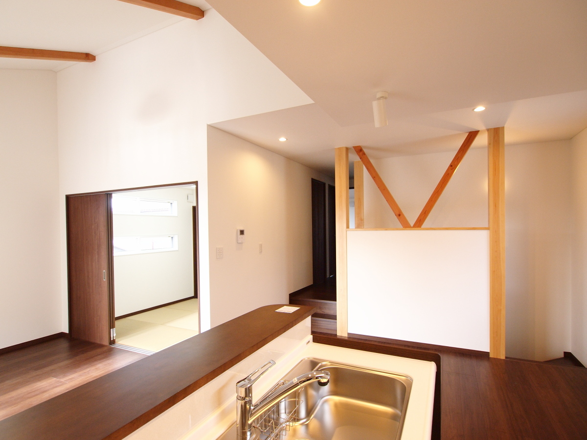 地方都市としては小さな宅地の為、2台以上の駐車スペースを確保する為にインナーガレージとし、採光と動線を考えてスキップフロアの中間階をリビングとしました。